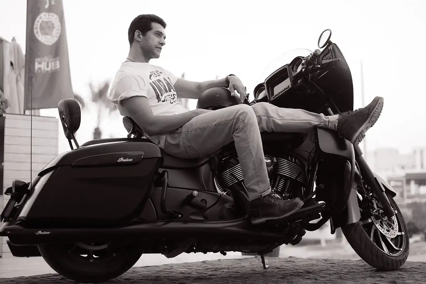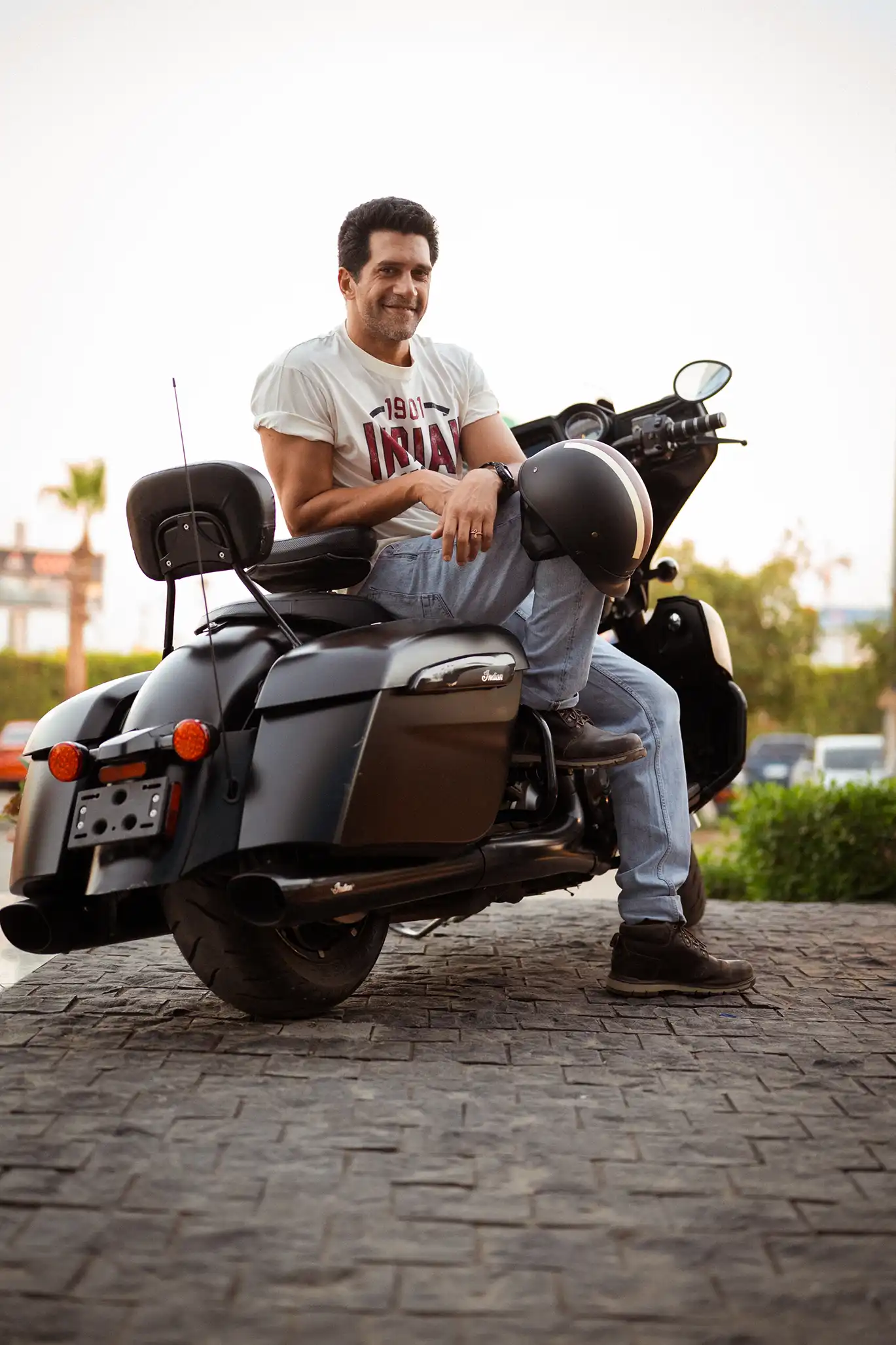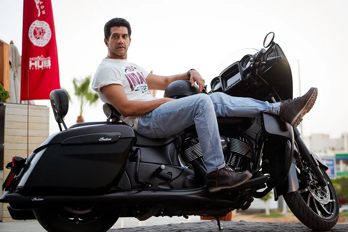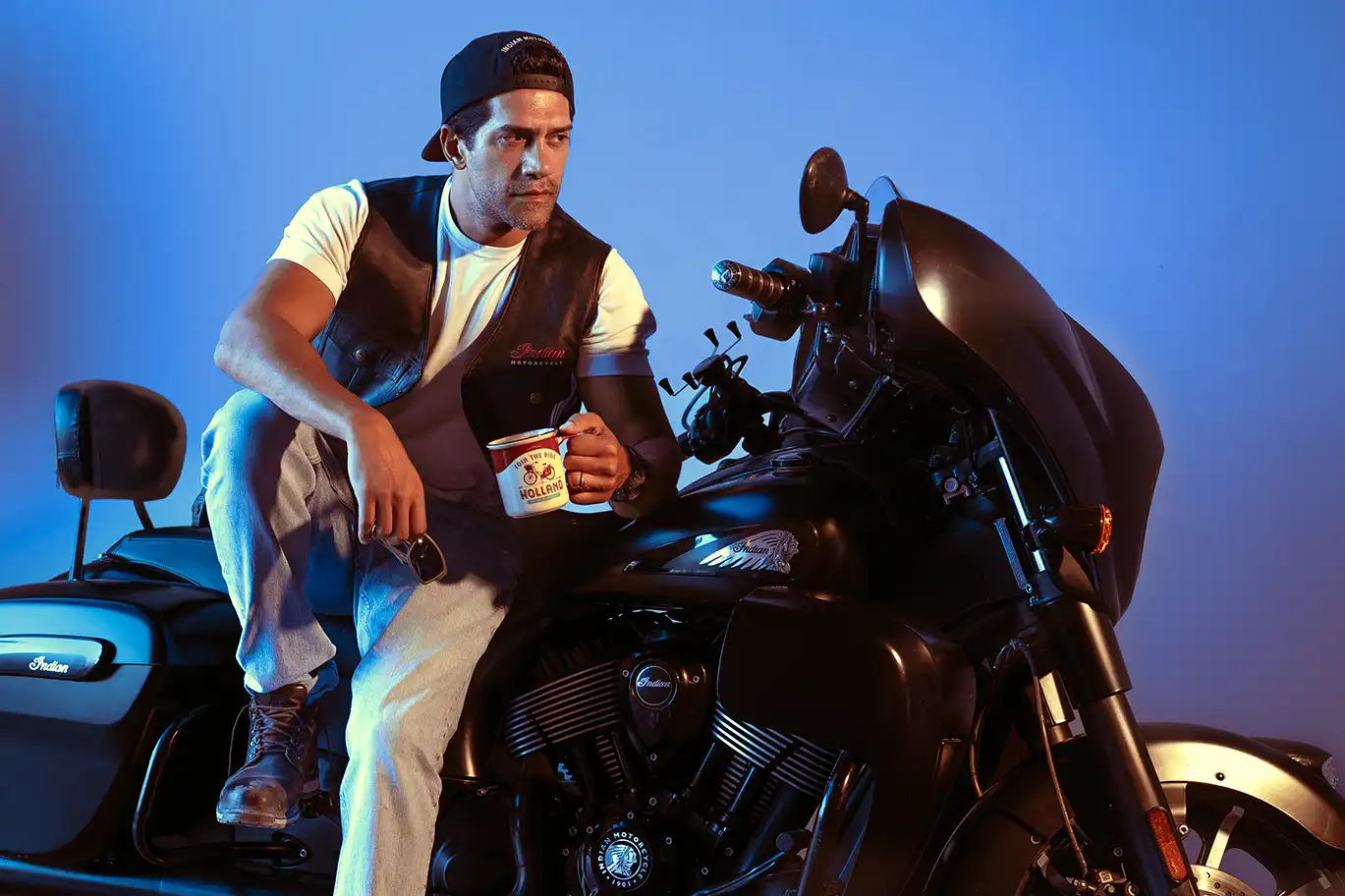 Located in Cairo, Motorsports HUB set the perfect scene. With Indian Motorcycles parked in the foreground and wide-open textures in the background, it became more than just a location — it added mood and motion to every shot.